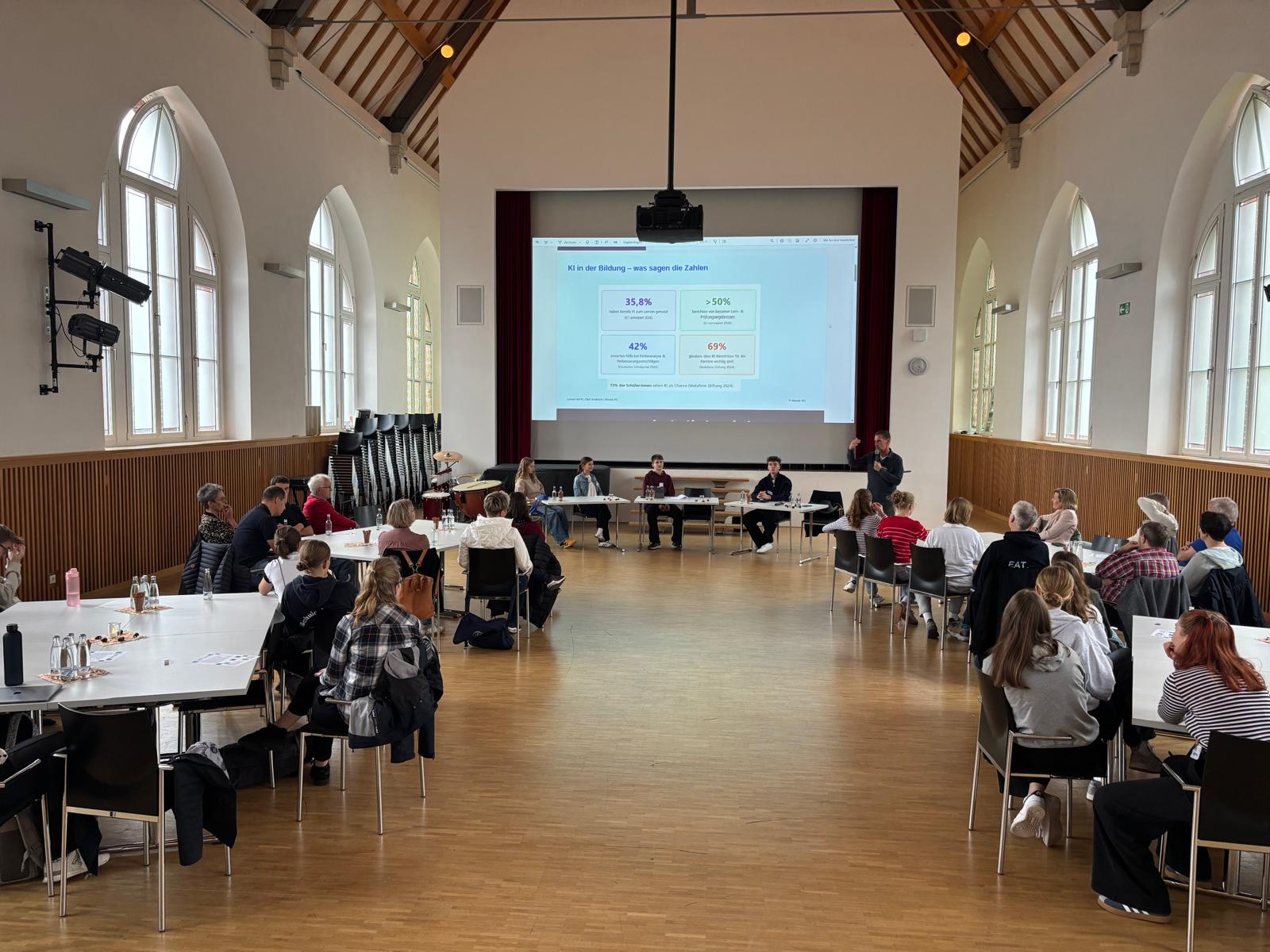 Alle Vortragenden kamen anschließend mit einem Schüler der Oberstufe sowie einer Lehrkraft zu einer Diskussion zusammen. Hier wurde unter der Moderation von Frieda Schütte und Carla Schwenken über Aufgaben und Chancen für die Schule in Bezug auf KI gesprochen. Insbesondere die aktive Auseinandersetzungen mit Themen, welche die Gesellschaft betreffen und verändern, wurde als Aufgabe für die Schule hervorgehoben. Dabei ist insbesondere die direkte Kommunikation und Begleitung zwischen Menschen in der Schule ein wichtiger Faktor. Die KI kann eine gute Unterstützung sein und für Arbeitserleichterung sorgen. Es ist aber wichtig, kritisch zu bleiben und Kompetenz im Umgang mit KI zu entwickeln.